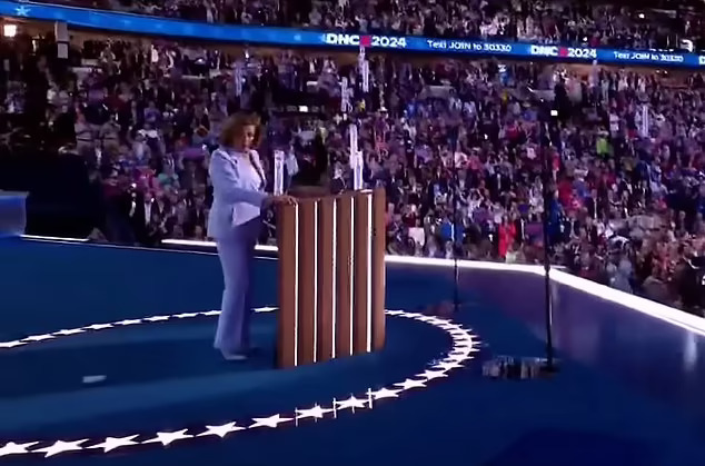 Таа дури и погледна наназад за да види што оставила зад себе додека се подготвуваше да ги даде своите забелешки во Чикаго, пред главниот говор од кандидатот за потпретседател и гувернер на Минесота, Тим Волц. Предметот остана на сцената зад калифорниската демократка.