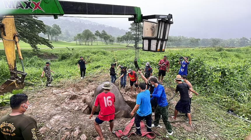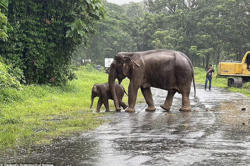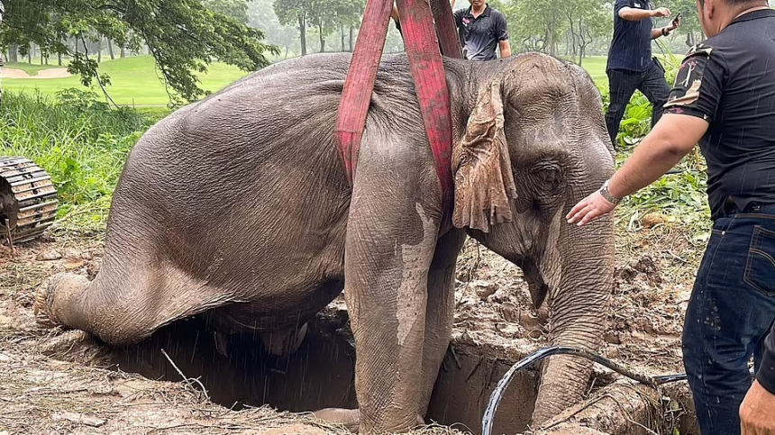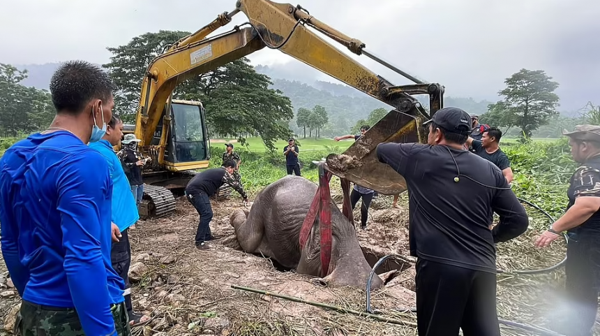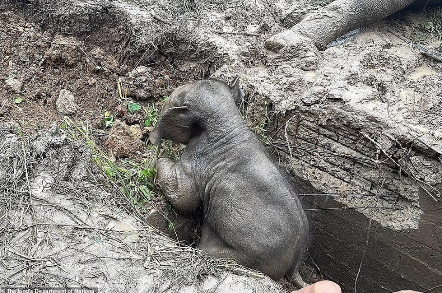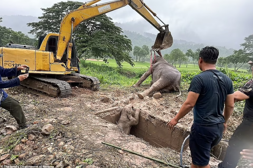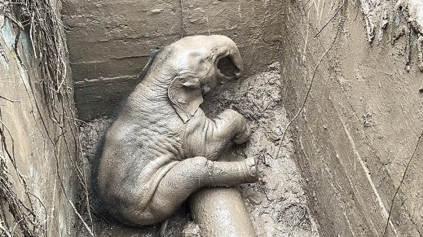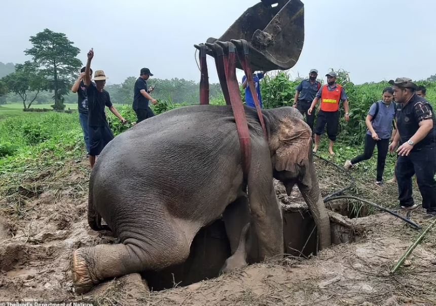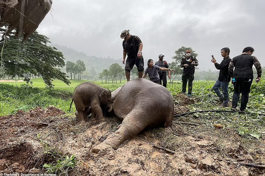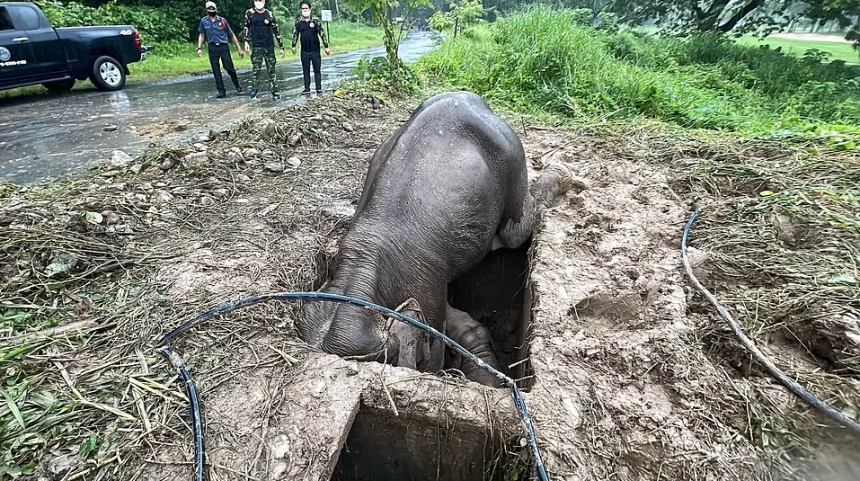 10-годишната слоница и нејзиното бебе, вчера попладне се лизнале во бетонски одвод поради силен дожд во Након Најок, централен Тајланд. Невремето ја навлажнило тревата и земјиштето станало лизгаво поради што мајката и ќерката паднале во дупка длабока 2 метри.