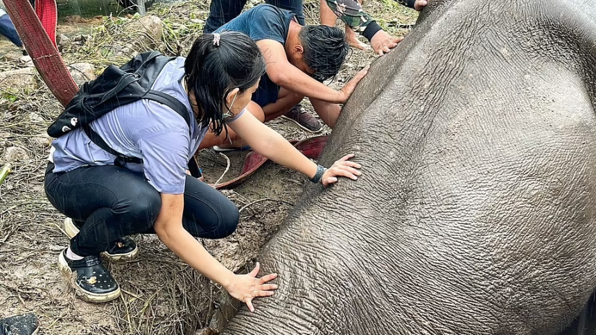 Водечкиот ветеринар на националниот парк, д-р Чанања Канчанасарак рече: „Беше невозможно да се доближиме до бебето додека мајката беше во близина, па ѝ дадовме три дози средства за смирување, но таа се придвижи кон своето бебе пред да се онесвести и ја удри главата“.
