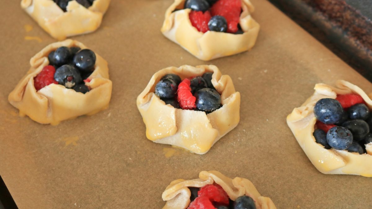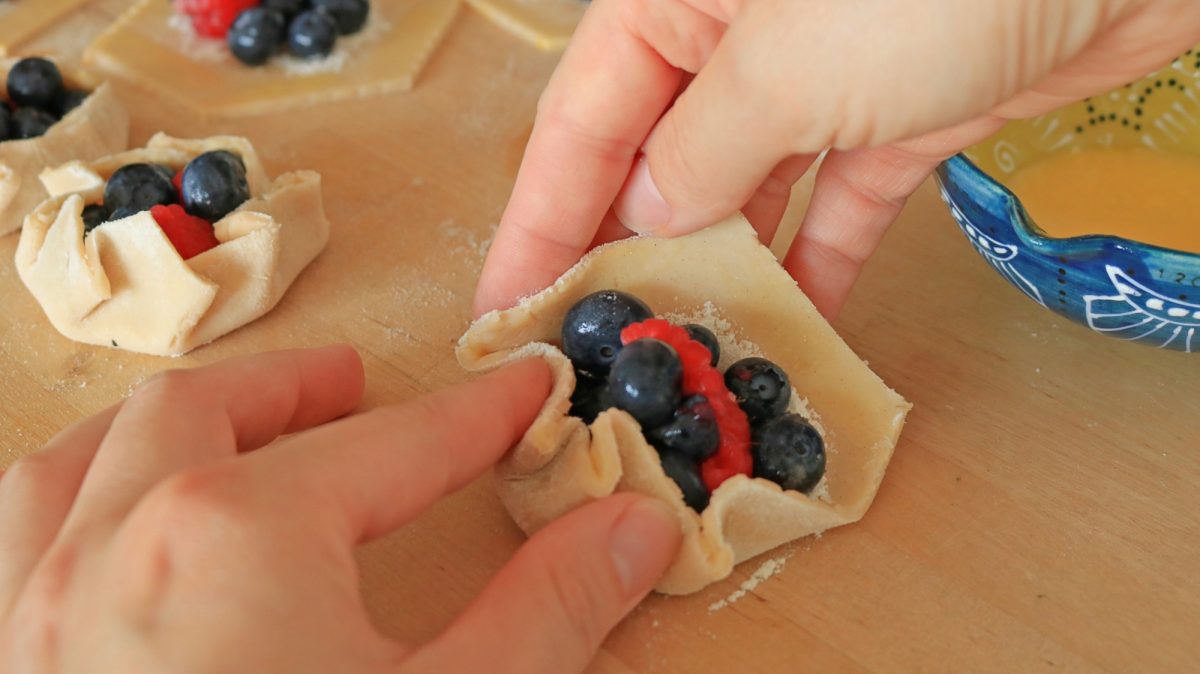 Летните бобинки испуштаат доста сок кога се печат. Вообичаено, за овошна пита, ќе го свариме филот за пита и ќе го згуснеме на шпоретот за да спречиме воден фил и влажна кора. Но, бидејќи овие галети имаат многу малку овошје, тој чекор би бил претеран. Наместо тоа, дајте ѝ на кората „водоотпорно“ бришење со малку пченкарен скроб и шеќер. Овој заштитен слој од скроб ќе ги апсорбира ослободените овошни сокови и ќе се желатинизира на топлината на рерната за да создаде сладок, густ сируп. Измешајте две лажички пченкарен скроб со три лажички шеќер. Намачкајте околу половина лажичка во центарот на секој круг од пецивото.