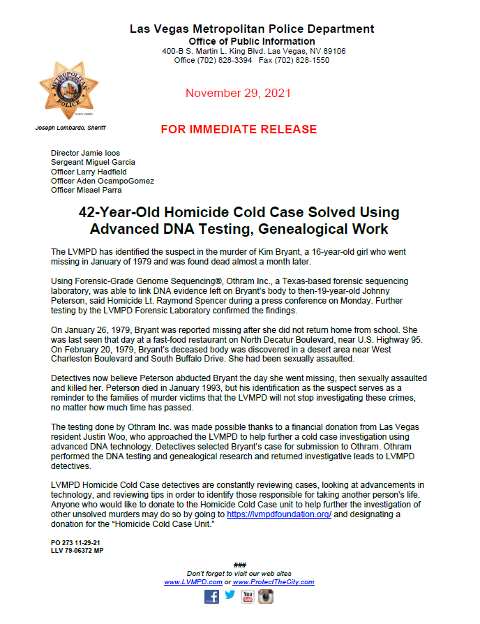„Пред десет дена бевме известени дека генолошкиот профил изграден од лабораториите „Othram“, врз основа на спермата пронајдена на телото на Ким Брајант на обдукцијата, откри дека Џони Блејк Петерсон бил лицето што ја киднапирало, с*ксуално ја нападнало и ја убило Ким Брајант“.