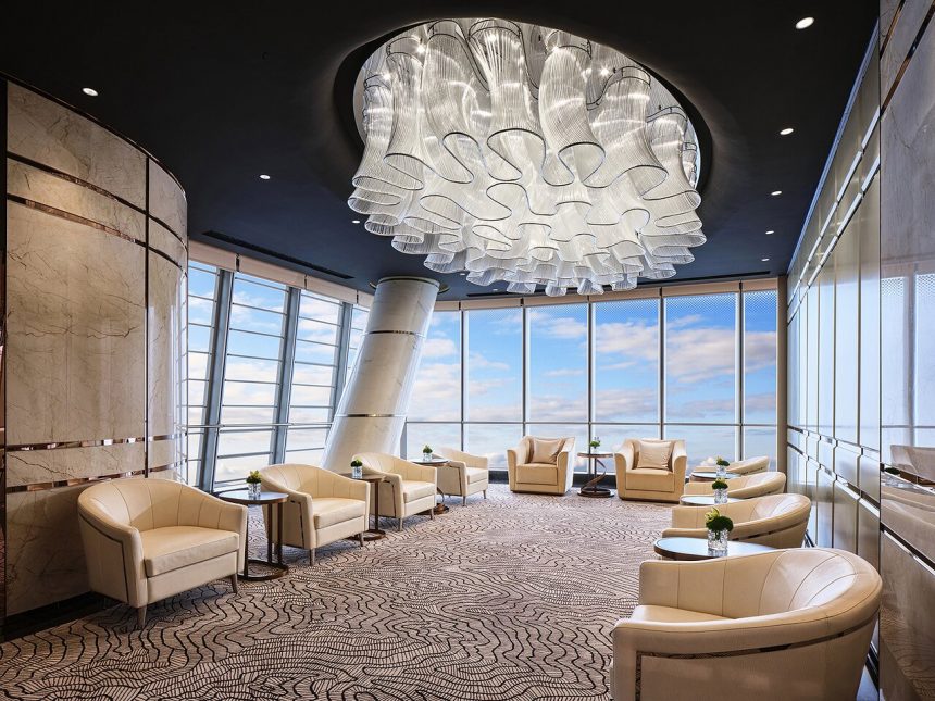 Оние кои сакаат приватност можат да резервираат места во еден од петте салони. Досега, највисокиот ресторан во зграда во светот беше Atmosphere во Бурџ Калифа, со 441,3 метри, а „највисокиот мобилен ресторан во зграда“, соодветно именуван Твист, се наоѓа на 422,8 метри на 106-тиот кат на Кантон Тауер во Гуангжу.