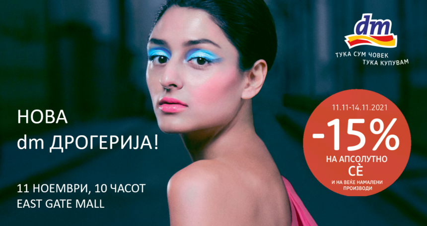 Од 11 па сѐ до 14 ноември, во новата дрогерија на dm, која ќе биде отворена во EAST GATE MALL – Ул. Беласица бр. 2, ќе може да уживате во неодоливи попусти од :