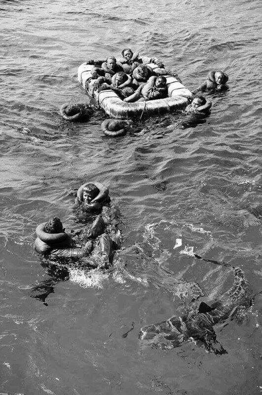 Преживеаните повеќе од три дена пливаат или лежат на импровизирани плотови низ површина од 250 квадратни километри. Само дел имаат спасувачки елеци. Многумина умираат од жед, отруени од морска вода, од топлотни удари, некои од ајкули. „Гледав како неколку луѓе загинаа од забите на ајкулите“, се сеќава 89-годишниот Дик Телин, „но двапати или трипати повеќе умреа затоа што пиеја морска вода.“ Кога на вториот ден морето ја врие од ајкули, од група од 80 луѓе преживуваат само 17…