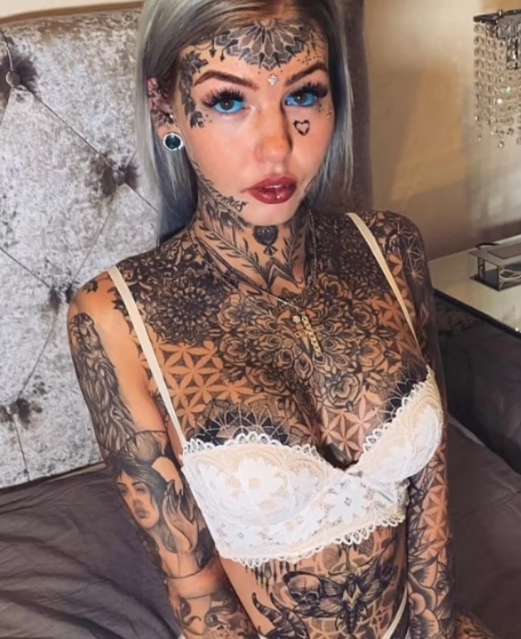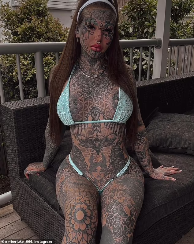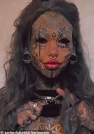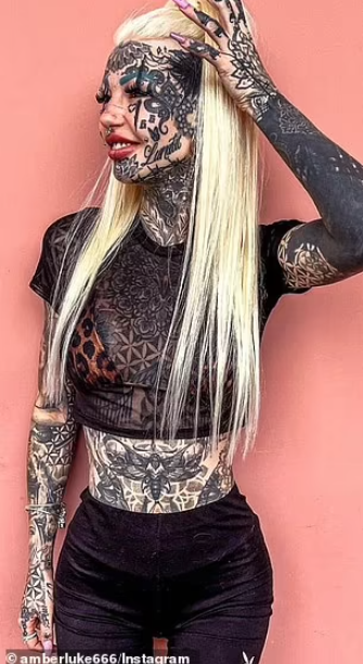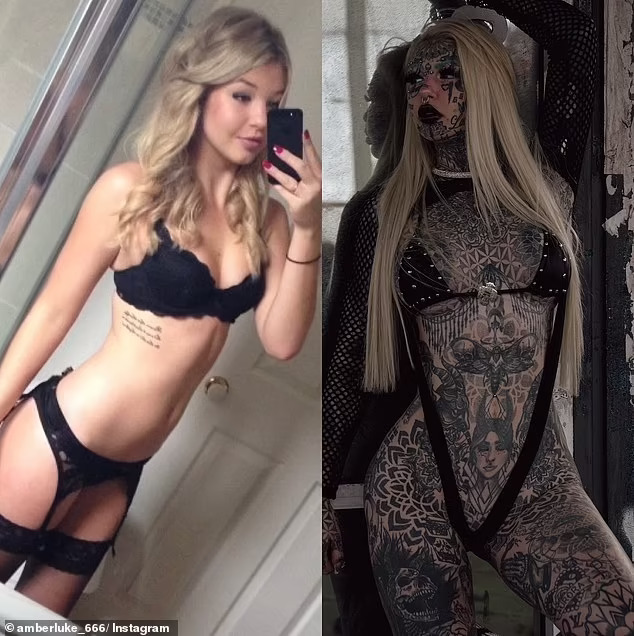 На придружната слика, Амбер покажа свежо, младешко лице без тетоважи и пирсови. Сега, 29-годишната девојка е покриена со тетоважи од глава до пети, вклучително и очното јаболко, па дури и го подели јазикот на половина за да личи на гуштер.