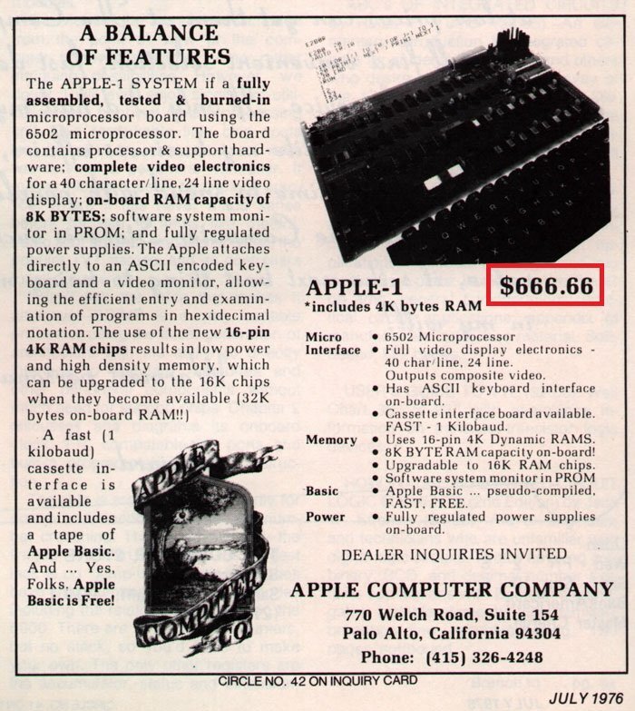 Apple-1 почнале да го продаваат летото 1976. Малопродажната цена – 666,66 долари – до ден-денес предизвикува мистични приказни и теории на заговор. Некои веруваат дека цената го симболизира „бројот на ѓаволот“. Сепак, Стив Возњак подоцна појаснува: „Цената требаше да биде околу 30% над набавната цена, и испадна 667 долари. Решивме седумката да ја смениме со шестка, за полесно да се печати. Јас отсекогаш сум сакал да има повторувачки броеви.“ Ниту цената, ниту компјутерот имале врска со библиски симболизам.