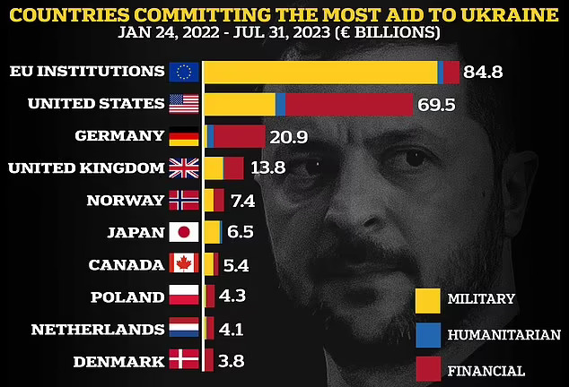 Одредбата за помош на Америка е само надмината од ЕУ како колектив, при што европските институции обезбедија 84,8 милијарди евра – иако речиси 80 милијарди евра од ова беа финансиска помош наместо воена.