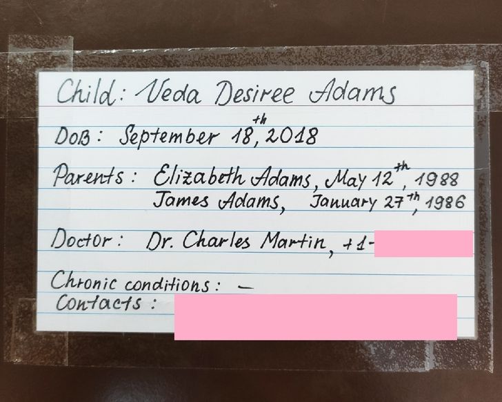 Често се случува по сообраќајна несреќа, родителите се се онесвестат, а пожарникарите наоѓаат дете. Тие немаат информации за детето или нивната здравствена состојба и не можат да прашаат никого. Одвојте неколку минути од вашето време и залепете индекс-картичка со информации до детското седиште во автомобилот. Запишете го името на детето, роденденот, имињата и контактите на детето, споменете ги медицинските состојби на детето, лекарот на детето, лековите што ги зема вашето дете и сè што е важно. Ова може многу да помогне и може да го спаси животот на вашето дете.