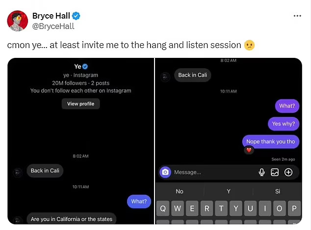 Во конверзацијата, првичната порака на Канје до 22-годишната девојка едноставно гласи: „Назад во Кали“.