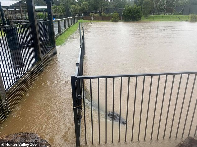 Фотографијата споделена од зоолошката градина во Хантер Доли покажува како еден алигатор во преден план навидум чека вода да се издигне над оградата додека остатокот од живеалиштето се претвора во езеро.