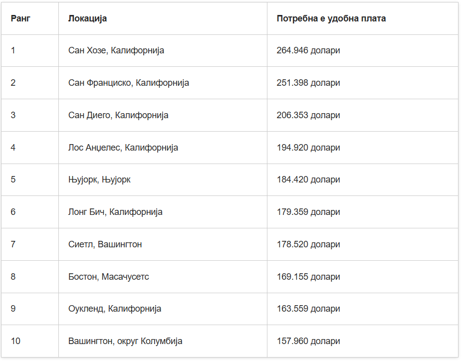 По Сан Хозе, каде што просечната цена на дом е над 1,5 милион долари и месечното плаќање на хипотека достигнува 8.563 долари, следуваат Сан Франциско, Сан Диего и Лос Анџелес. За разлика од нив, најевтиниот од 50-те најголеми американски градови е Детроит, каде доволни се 65.733 долари годишно за комфорно живеење.