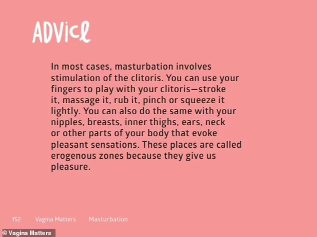 Под „совет“ се додава: „Можете да ги користите прстите за да си играте со вашиот клиторис – галете го, масирајте го, тријте го, штипнете го или лесно стискајте го“.