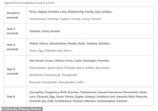 Основното училиште Калверли во Западен Јоркшир ги наведува „влажниот сон“ и „мастурбацијата“ во договорениот вокабулар за часовите на девет и 10-годишни деца.