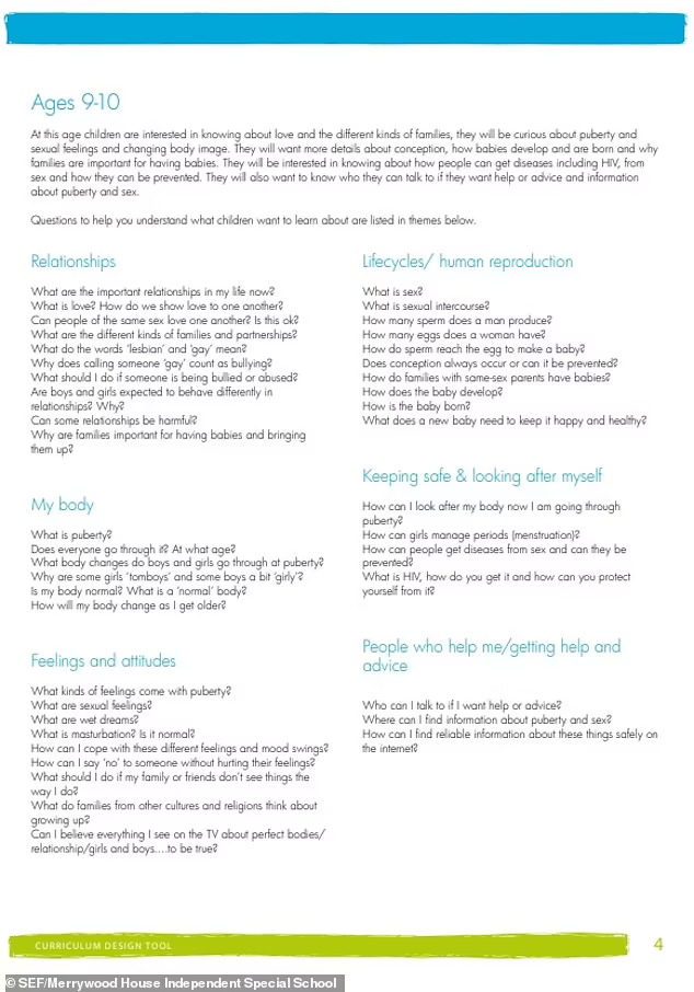 План за лекции усвоен од СЕФ од независното специјално училиште Меривуд Хаус, во Сари, наменето да ги научи момчињата и девојчињата на возраст од девет години за „мастурбација“, „влажни соништа“ и „сексуални чувства“.