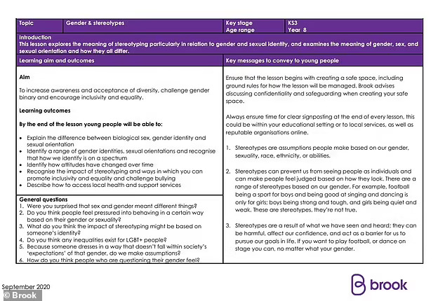 Планот за лекции создаден од добротворната организација за сексуално здравје, Брук, вели дека една цел на учење од класата за родови и стереотипи е да може да „идентификува низа родови идентитети, сексуални ориентации и да препознае дека начинот на кој се идентификуваме е на одреден спектар“.