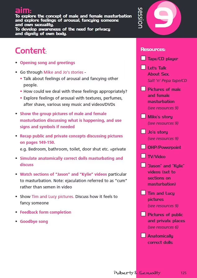 Според програмата овој дел првпат се предава за мастурбацијата „кога повеќето деца веќе имаат девет години“.