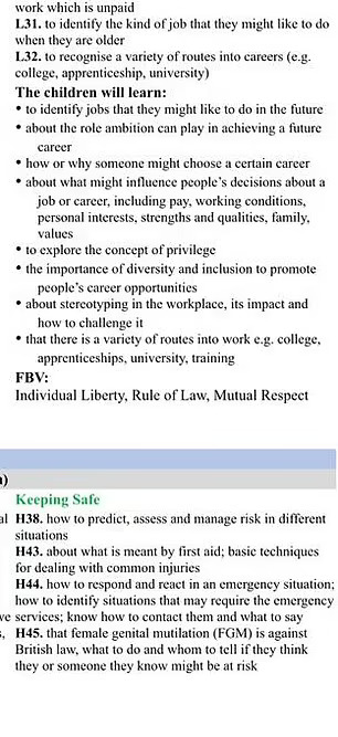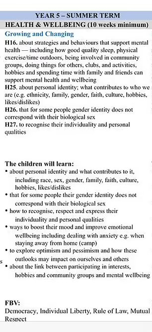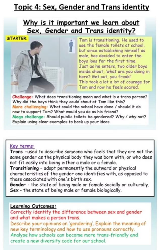 Планот за лекција на друго училиште вели дека девет и 10-годишните деца треба да научат дека родовиот идентитет може да се разликува од биолошкиот пол и дека различноста и вклученоста се важни во промовирањето на можностите за кариера.