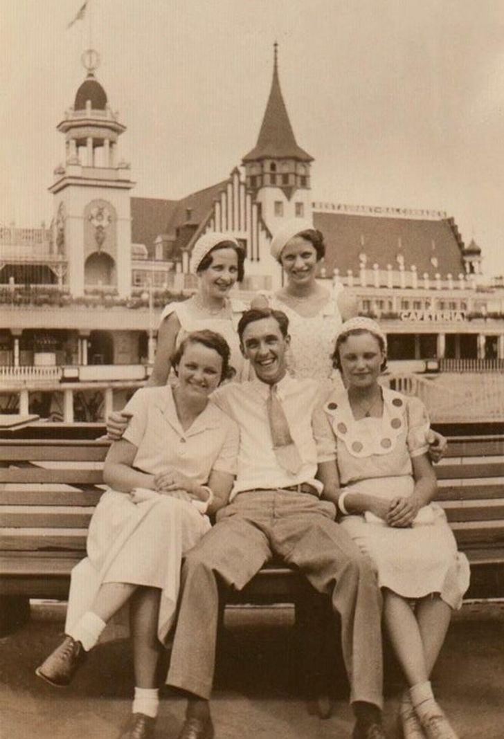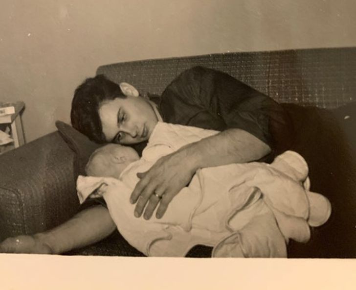 14. „1957 година, дедо ми (18), ја држи мајка ми на каучот на неговиот родител“.