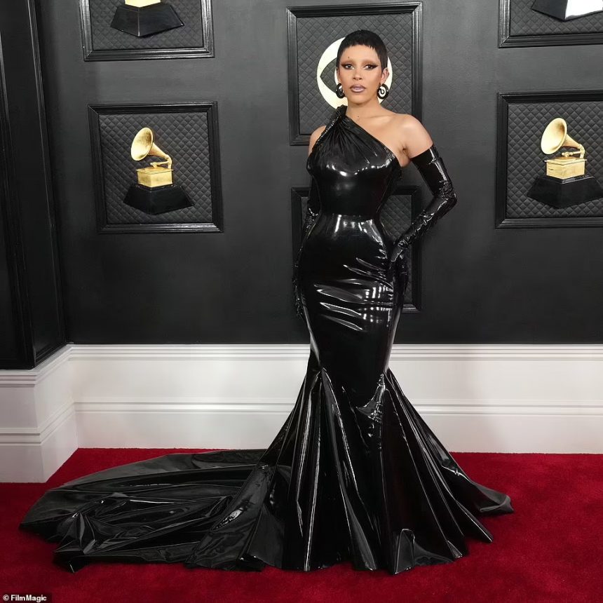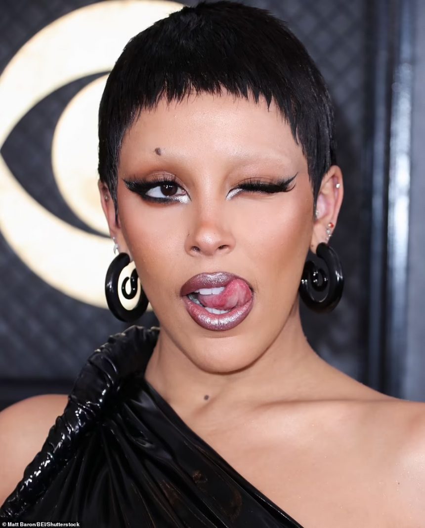 Doja Cat воодушеви во црна винил тоалета на Версаче со впечатлива шминка за очи и пикси фризура; Сето ова совршено ја истакна нејзината слатка фигура.