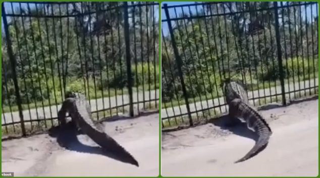 Застрашувачки момент кога џиновски алигатор едноставно ја пробива новопоставената метална ограда во голф-клуб во Флорида