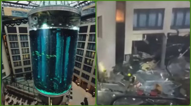Се скрши и истече аквариумот „Аквадом“ во Берлин, кој беше висок 16 метри и наполнет со 1 милион литри вода