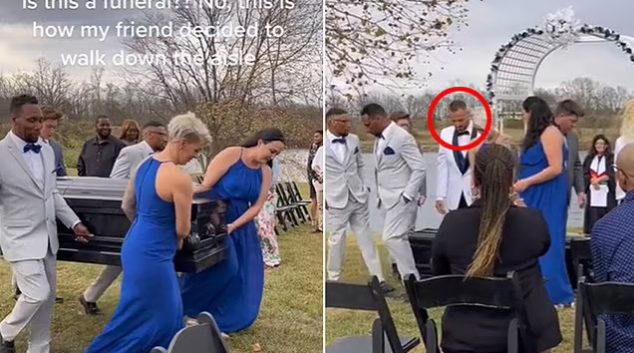 Младоженецот е критикуван за неговото „непочитување“ на венчавката, откако направи збунувачки избор да биде однесен по патеката во ковчег – кој го подигнаа до олтарот деверушите на неговата идна сопруга. Скролајте надолу за видео Бизарниот влез на мрачниот младоженец беше снимен на камера од страна на гостин на свадбата, кој го сними моментот …