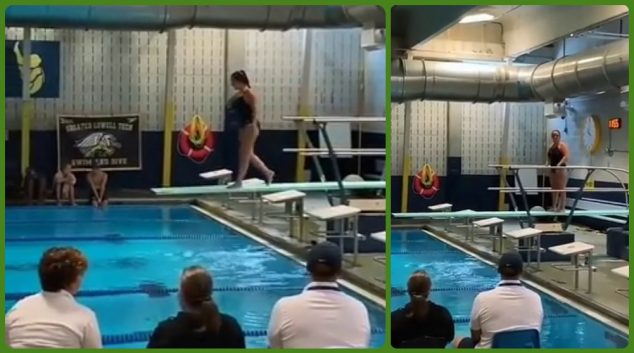 Девојката можеби е малку пополничка од очекуваното, но каква техника на скокање во базен има… Импресивно!