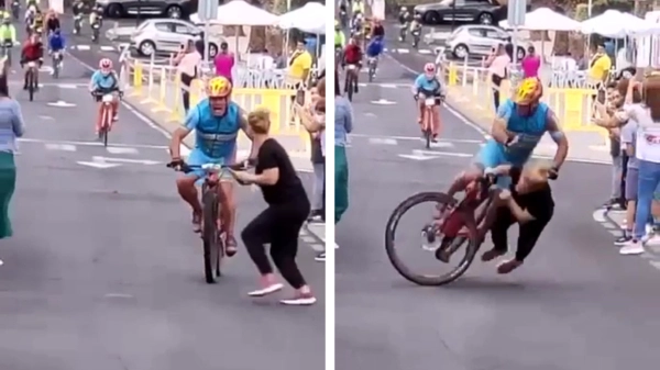 Несмасна дама поминува улица на велосипедска трка