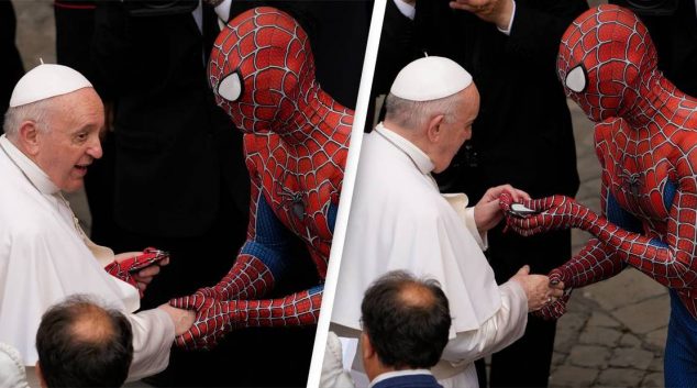 Човек облечен како Спајдермен присуствуваше на обраќање од страна на папата Францис, во Ватикан на, 23 Јуни. Не е јасно дали возел до таму или се довлечкал на пајакова мрежа. На фотографиите се гледа како папата Францис се поздравува со легендарниот лик од стрипот, а Спајдермен му подарува на 84-годишникот маска иста како неговата. Дали …