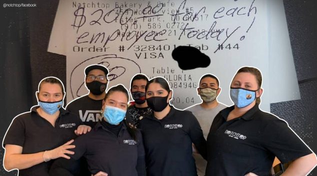 Ова се тешки времиња и секој би сакал да биде почестен, но овие луѓе дефинитивно не очекувале вакво нешто на обичен работен ден. Седум членови на персоналот во „Notchtop Bakery & Café“ во паркот Естес во Колорадо пријатно се изненадија. Клиентот, познат само како Дејвид, на својата сметка од 20 долари оставил по 200 долари …