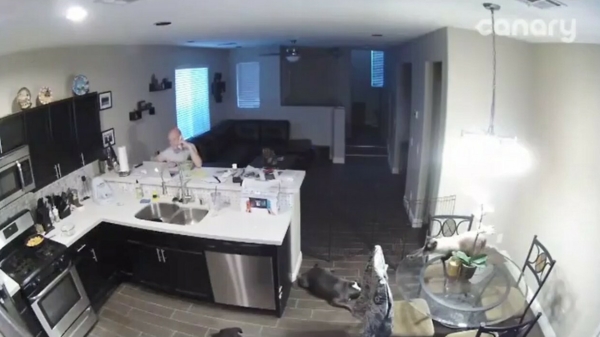 Двете кучиња ја опколиле мачката околу масата и сега нема каде да бега, но мачката е снаодлива
