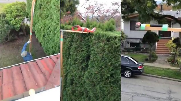 Креативниот човек смисли начин како право да ја исече високата жива ограда