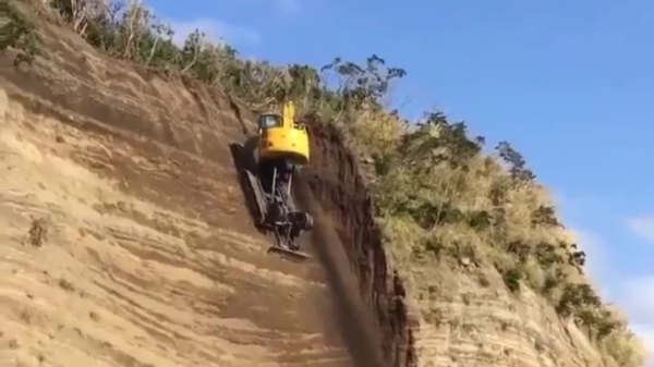 Лудак со багер копа речиси вертикално за да направи потпорен ѕид над автопатот