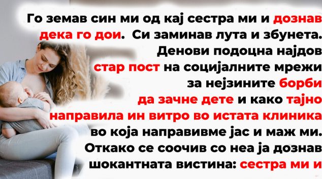 Пред неколку недели, го земав мојот шестмесечен син од куќата на мојата сестра. Понекогаш го чува, и секогаш сум ѝ верувала. Тој ден стигнав порано и ја затекнав како го дои мојот син. Застанав вкочането. Во првиот момент не ме забележа, а јас стоев таму, без да знам што да направам. Кога влегов, ми објасни …