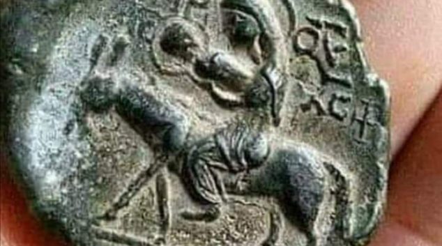 Македонска монета на која што се претставени Марија и Исус Христус на магаре со КИРИЛИЧНИ БУКВИ на неа