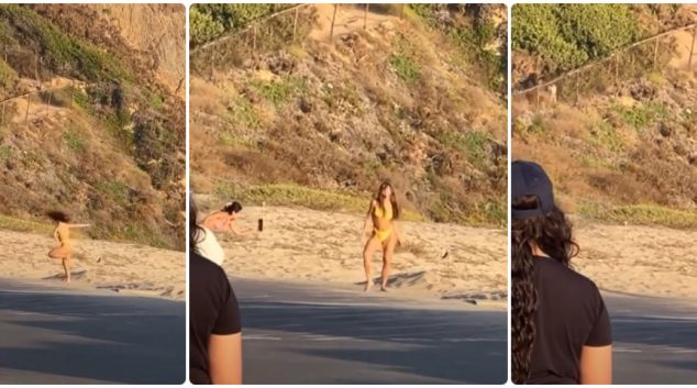 На девојката во бикинито изгледа ѝ е жешко на нозете, па се размрда малку