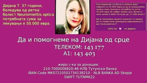Дијана боледува од ретката болест Neuromyelitis optica која го напаѓа имуниот систем и го оштетува р’бетниот мозок и нервите на очите. За нејзиниот третман потребни се 50 илјади евра. Недостасуваат уште 20 илјади евра и таа ќе може да го започне третманот! „Драги хумани луѓе јас Дијана Т. боледувам од ретка болест Neuromilit Optucus болест …