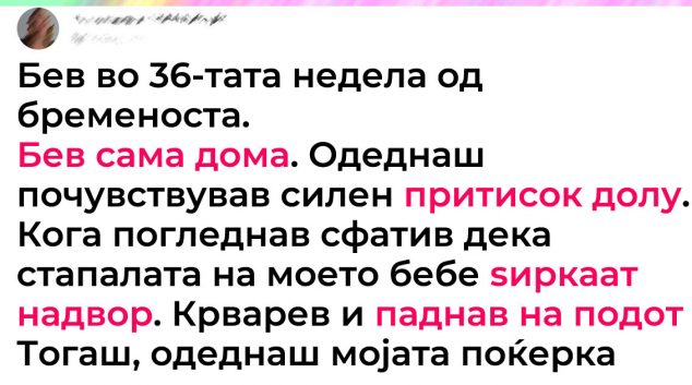 „Пред неколку недели бев во 36-тата недела од бременоста. Мојот сопруг замина во 8 часот наутро и ги одведе нашите две помали деца во куќата на неговите родители, а мојата поќерка веќе замина на училиште за тој ден. Бев сама дома кога одеднаш почнав да добивам контракции, ја чистев детската бања и почувствував голем притисок …