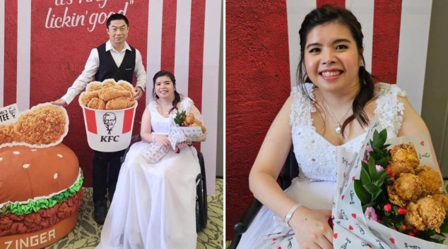 „Имав свадба од соништата на тема „KFC“!!” вели Лејнг Ле Вонг (32) од Сингапур, во нејзината објава на „Фејсбук“. „Навистина е кул да го имам @KFC_SG на мојот посебен ден“, рече невестата, која размени завети со својот сопруг Кси Пенг (40) на 26 ноември, додавајќи: „Благодарение на ова тоа стана уникатен и …