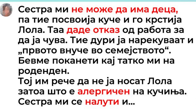 „Мојата сестра не може да има деца и сака да го третираме нејзиното куче како мојата ќерка. Тоа што го направи кај татко ми на роденден ги премина границите. Дали сум во право дека така изреагирав?“