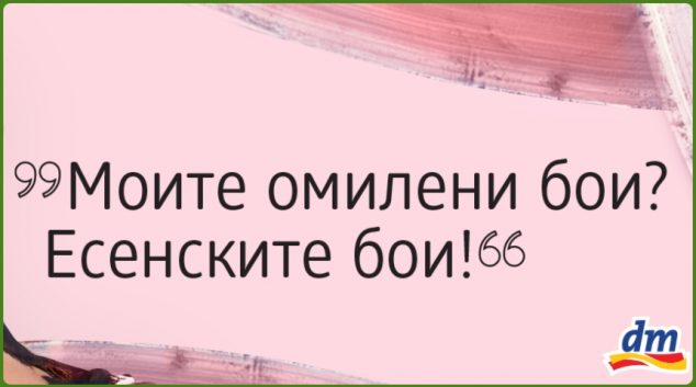 Со доаѓање на есента не престанува шаренилото од бои, нијанси, слободата во нивното комбинирање и храброста во создавање на нов и смел изглед. Напротив, треба да продолжиме уште посмело во нови предизвици, самоуверено и храбро! Главниот фокус оваа есен во dm дрогериите се токму боите и поттикот да се задржи шаренилото со слоганот: ,,Мојот свет …