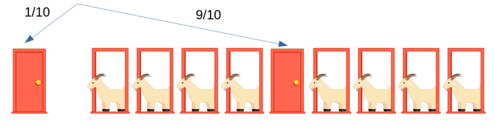 Замислете наместо три имате десет врати. Ја избирате една (10% шанса за автомобилот). Монти Хол отвора осум врати со кози, оставувајќи само ваша и уште една затворена. Дали менувате? Се разбира! Сите 9 непогодени врати имаат 90% шанса, а сега кога осум се празни, целата веројатност оди на последната неоткриена!