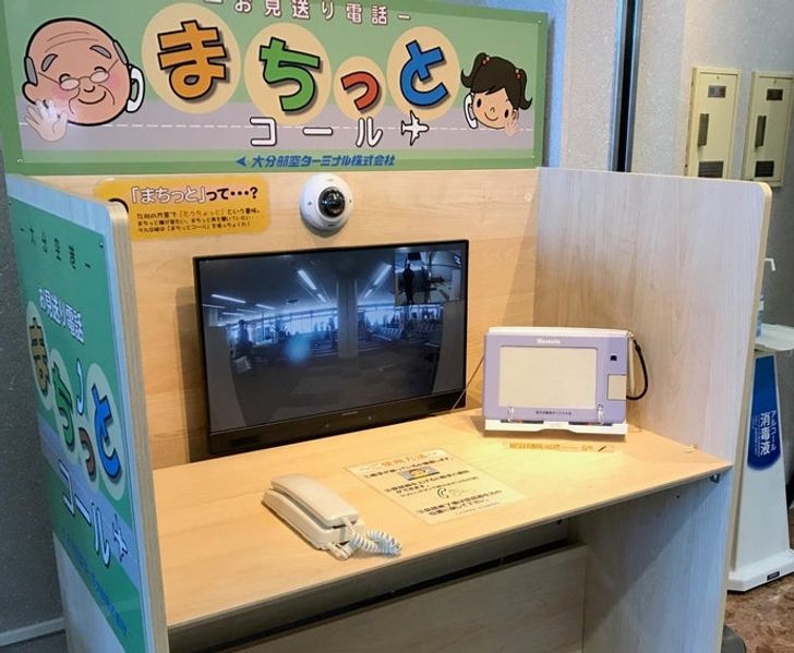 „Овој видео -телефон на јапонскиот аеродром ви овозможува да ги испратите луѓето откако ќе го поминат обезбедувањето“.