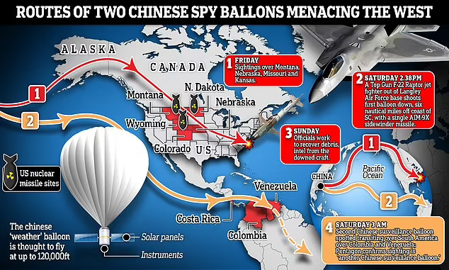 Авионите на воздухопловните сили го соборија балонот што предизвика јавен бес поради дрските тактики за шпионирање на Пекинг во саботата, веднаш до брегот на Јужна Каролина. Прво беше откриен како преминува на територијата на САД на 28 јануари, накратко помина низ Канада, а потоа помина низ неколку држави во континенталниот дел на САД пред да биде урнат на 4 февруари.
