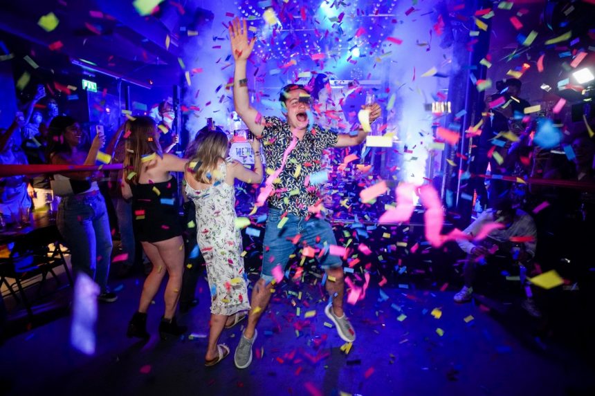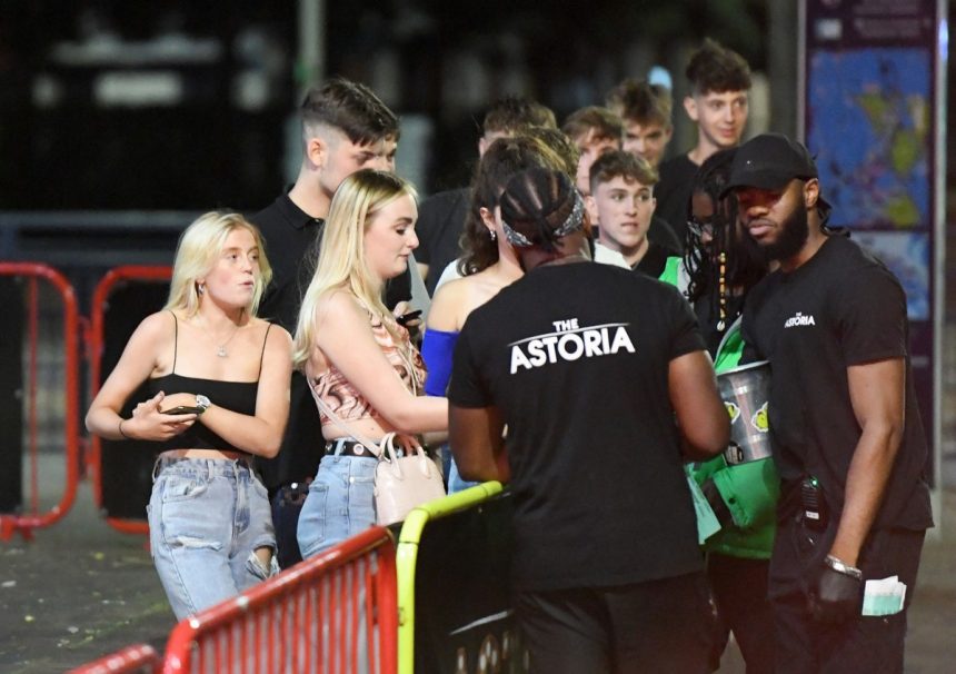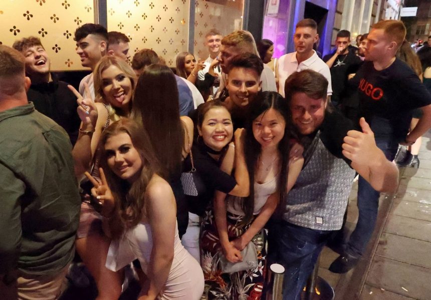 Пијани Британци уживаа во првата петочна вечер на слобода откако беа укинати ограничувањата на Ковид и прославувачите се упатија кон клубовите и баровите. Фотографиите покажуваат огромна толпа народ што се собира да танцува на првиот викенд надвор од градот, првпат по година и половина.