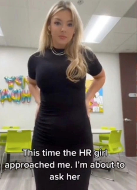 Насловот гласи: „Овој пат ми пријде колешката од човечки ресурси. Ќе ја прашам“, додека русокосата им ја покажува облеката на гледачите.