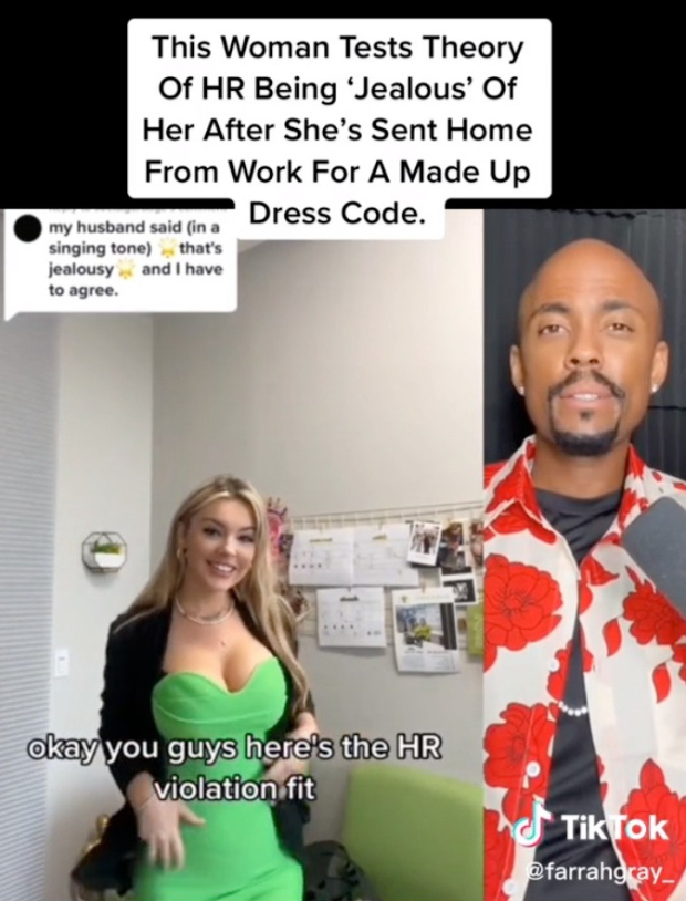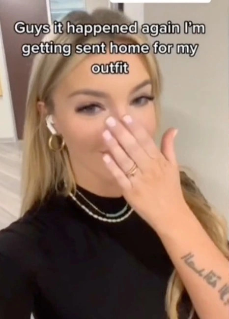 Корисничка на „TikTok“ по име Фара Греј сподели уште еден клип на кој е испратена дома од работа, наводно поради нејзината облека. Русокосата мисли дека ја испратиле дома затоа што жената која работи во „HR“ е љубоморна на неа.