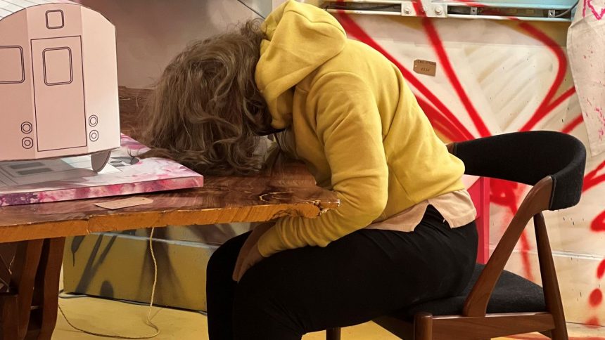 Инсталацијата прикажува жена облечена во тренерки и жолто спуштено лице со качулка напред во чинија со супа, а нејзината долга руса коса го крие нејзиното лице. Реалистичката скулптура е на американскиот уметник Марк Џенкинс и е базирана на сестрата на г-дин Лазаридес.