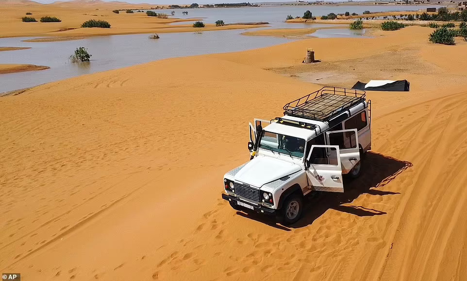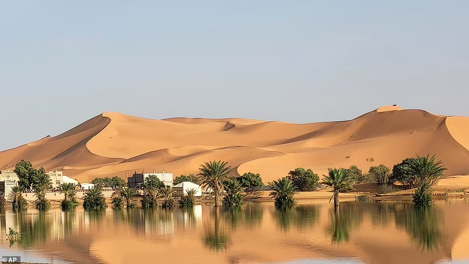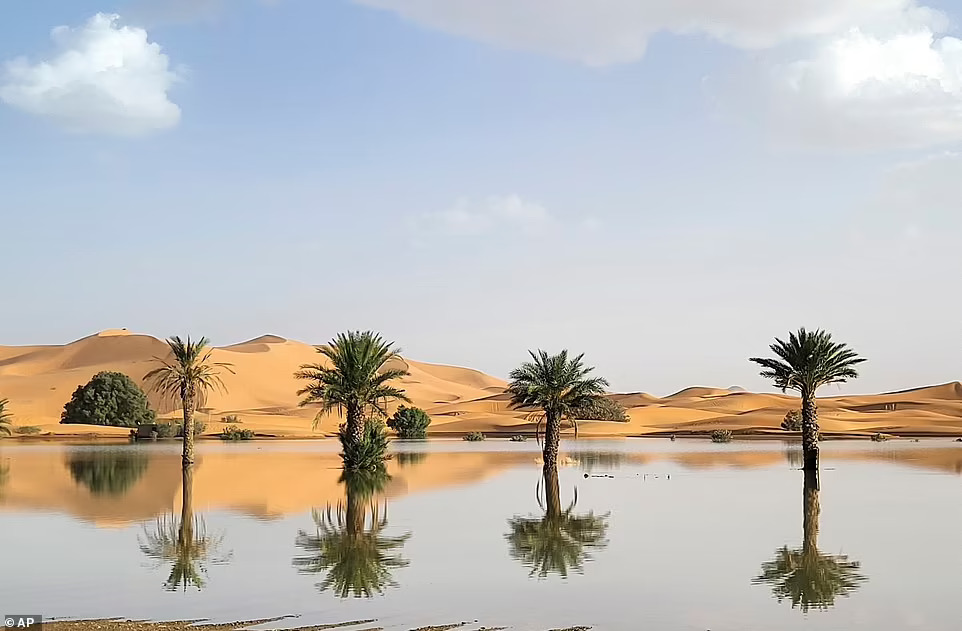 Редок потоп од врнежи остави сини водени лагуни среде палмите и песочните дини на пустината Сахара, хранејќи ги некои од нејзините најсуви региони со повеќе вода отколку што виделе со децении.