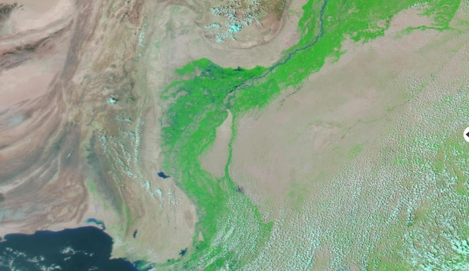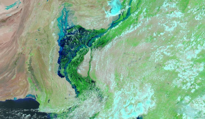Новите снимки направени на 28 август од орбитирачкиот сателит на „НАСА“ покажуваат како комбинација од обилни врнежи и излевање на реката Инд поплави голем дел од јужниот дел на Синд.